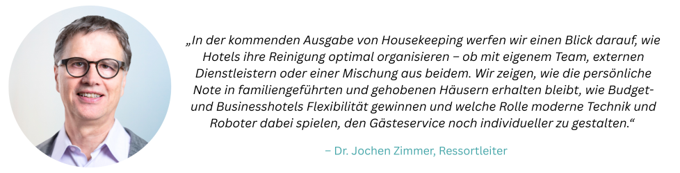 Housekeeping ist das Herz jedes Hotels. Es schafft die Grundlage dafür, dass Gäste sich rundum wohl und willkommen fühlen. In unserem Print-Special rücken wir diesen wichtigen Bereich in den Fokus und geben Ihnen die Möglichkeit, Ihre Produkte und Dienstleistungen unseren Lesern zu präsentieren. Dr. Jochen Zimmer gibt Ihnen einen kleinen Einblick, welche aktuellen Themen Sie in dieser Ausgabe erwarten dürfen.