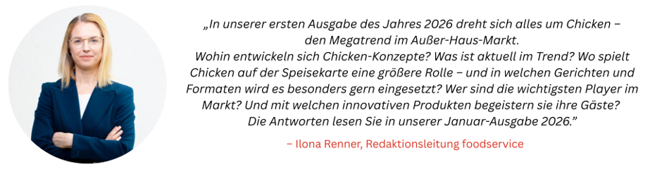 ersten foodservice-Ausgabe 2026 dreht sich alles um Chicken. Unsere Redaktionsleitung Ilona Renner gibt Ihnen einen exklusiven Vorgeschmack darauf, welche