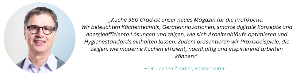 Küche 360° dreht sich alles um die Profiküche in all ihren Facetten. Wir bieten Ihnen einen umfassenden Rundumblick und zeigen, welche Themen für Profis in der Gastronomie besonders relevant sind. Redakteur Dr. Jochen Zimmer gibt spannende Einblicke: